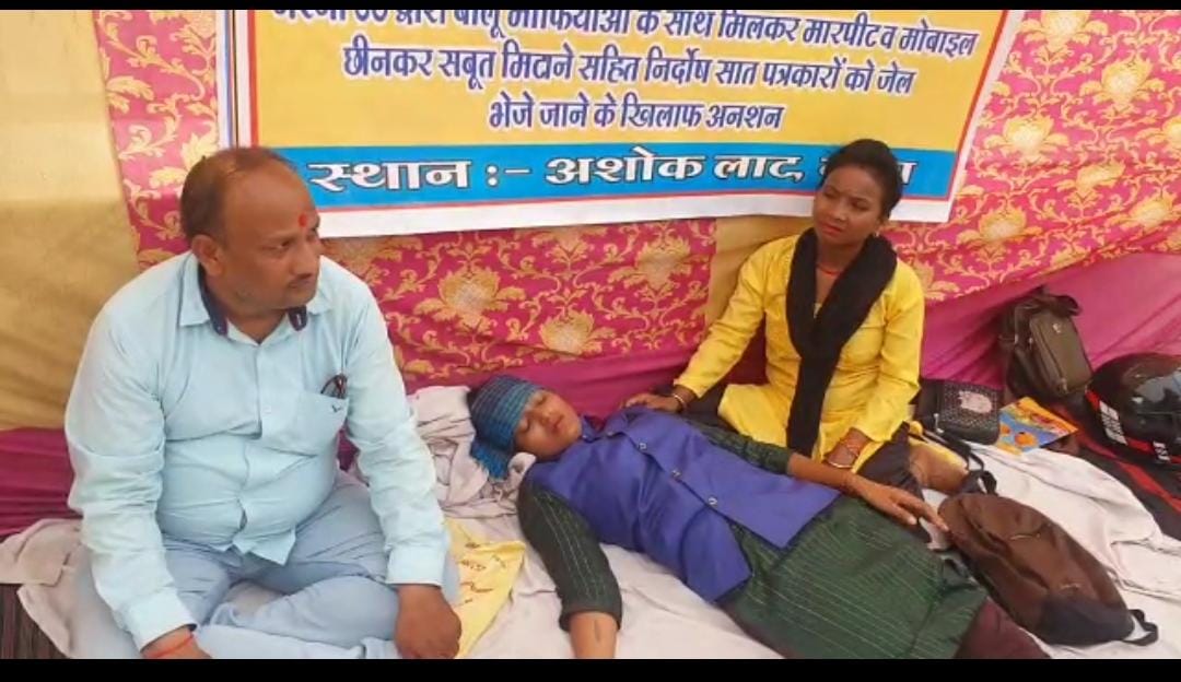 आपको बता दें जनपद बांदा के सात पत्रकारों को बालू माफियाओं के द्वारा प्रशासन की सांठगांठ से फर्जी मुकदमा पंजीकृत करा करके जेल भेज दिया गया है। जिसको लेकर बांदा जनपद के पत्रकार अशोक लाट स्तंभ के नीचे अनशन स्थल पर अनशन पर पिछले 5 दिन से अनशन पर बैठे हुए है।